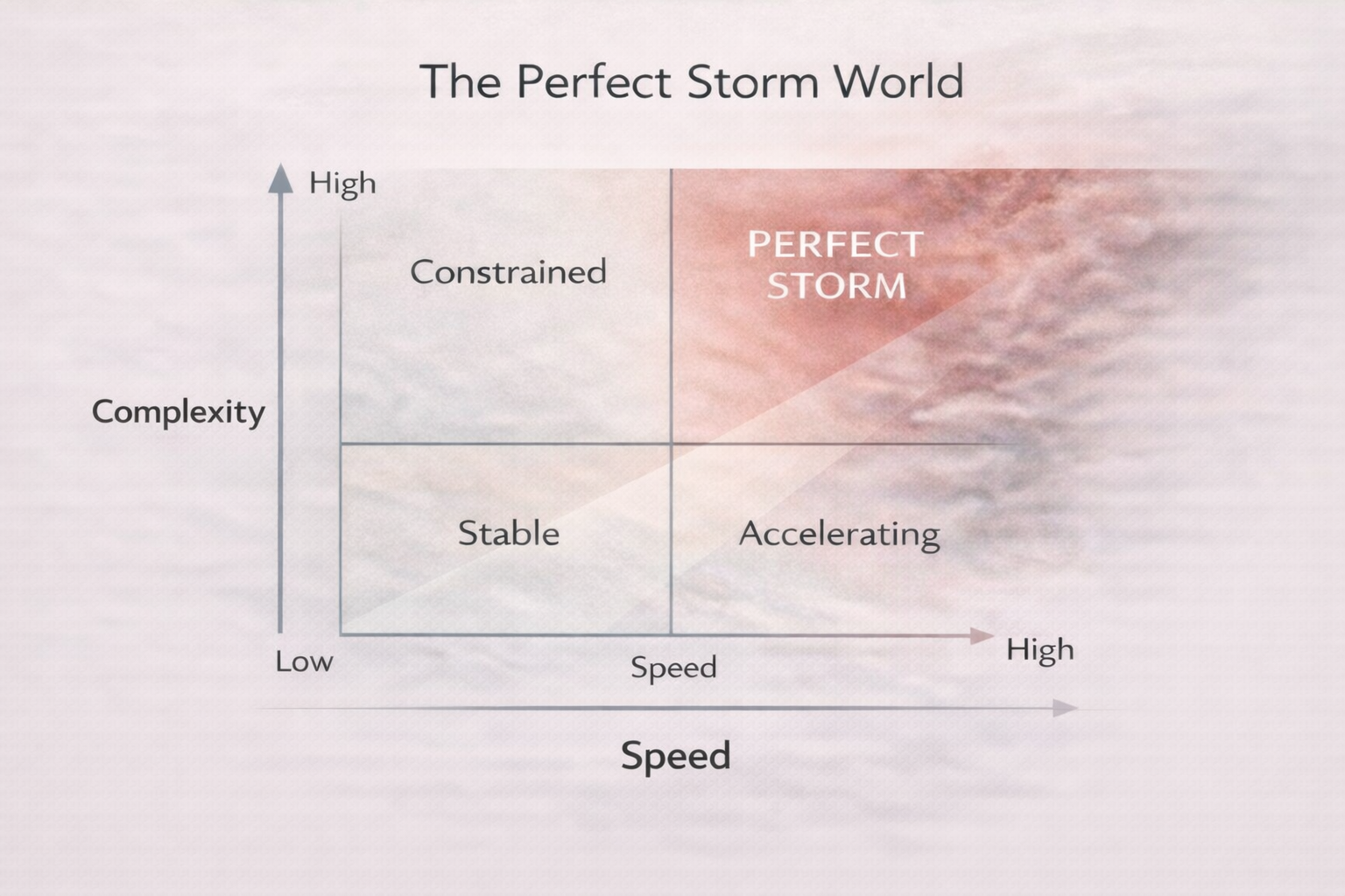 The Guardrails Are Gone Our businesses were designed for a predictable world.Now we are entering a Perfect Storm. Perfect Storm: A turbulent field where interacting systems overpower individual actors. View fullsize Do traditional risk models still work?◻ Yes — Thanks for visiting◻ No — Continue